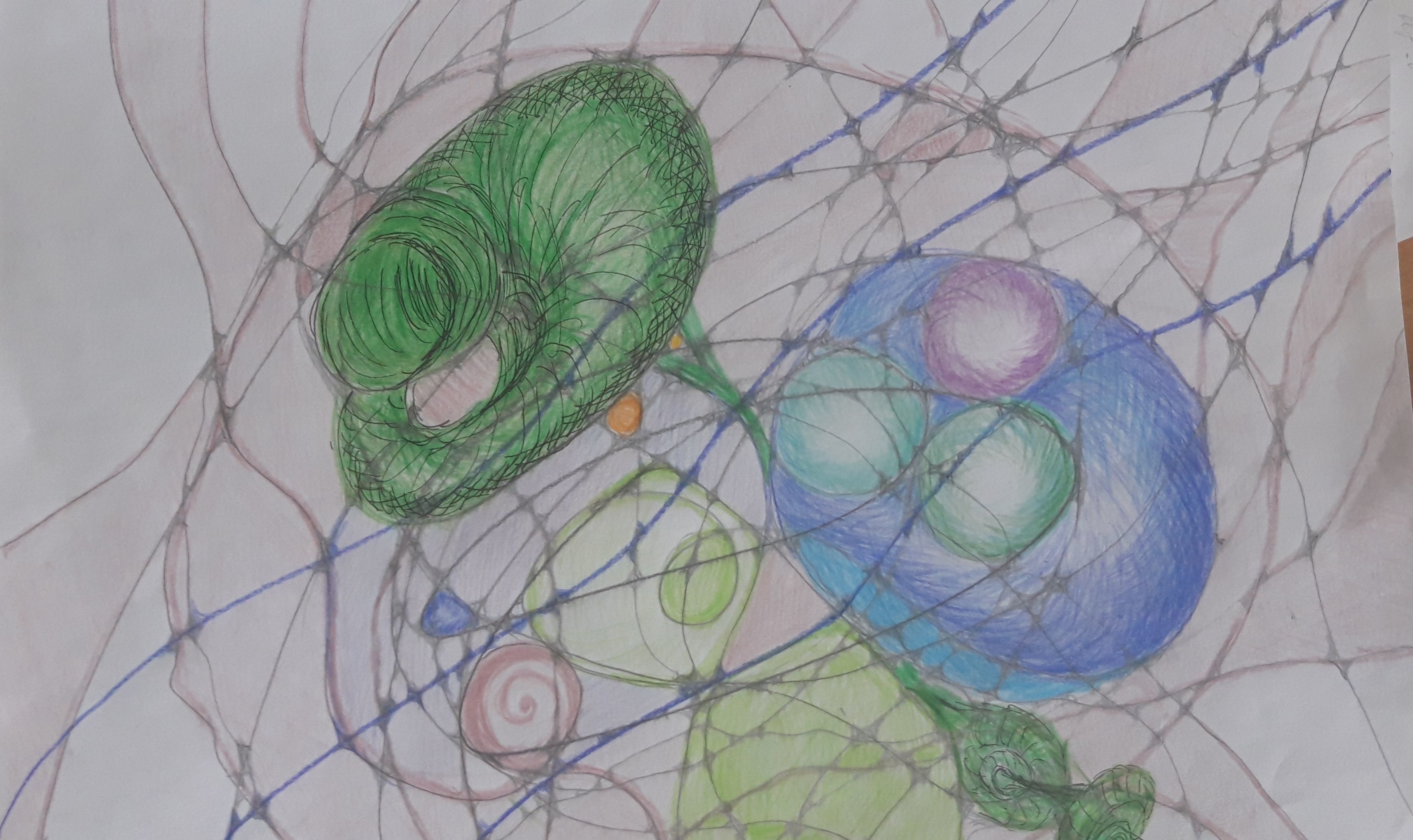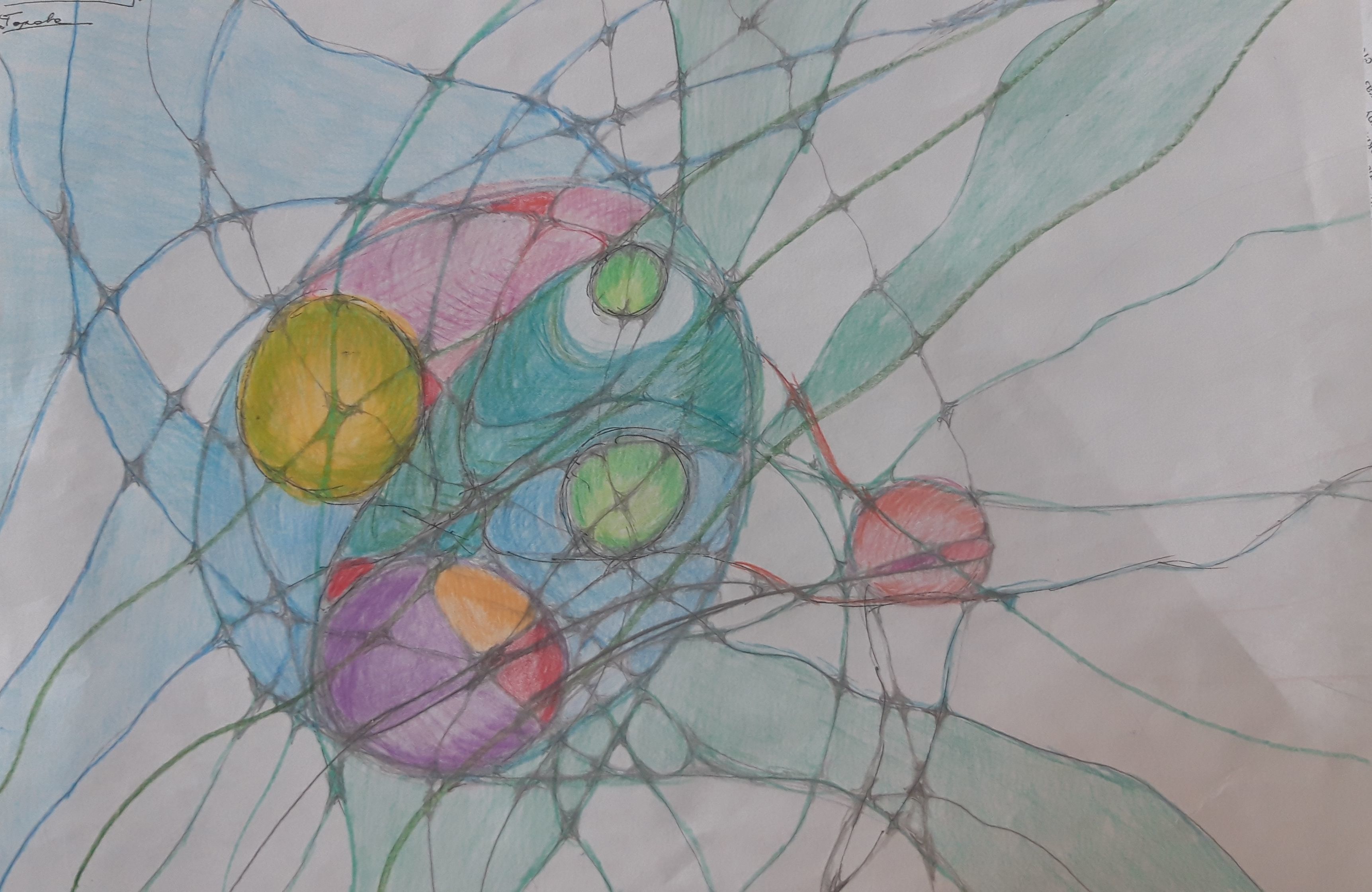 На рисунке человек изобразил воспринимаемые вибрационные волновые потоки, проходящие через энергоструктуру. Момент возникновения волновых толчков низких вибраций провоцирует какая-либо ситуация. В середине изображения показана точка или апогей всей мощнейшей низкой энергии которая словно волна прокатываясь и передавая по остальным нейронам, проводит свой энергозаряд, характерный разрушительной цепи, которая оставляет след в нарушении эмоционального давления, разбалансировки. Как вывод - страх, нервозность, злость и так далее.